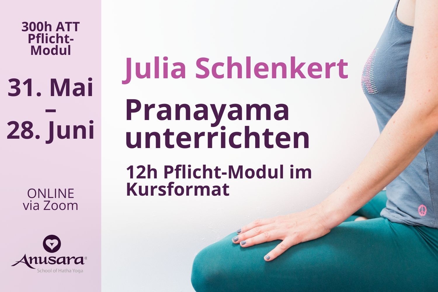 31. Mai - 28. Juni 2026 Pranayama unterrichten sonntags 18:30 - 20:30 Uhr und mittwochs 20:00 - 21:00 Uhr (Praxis)